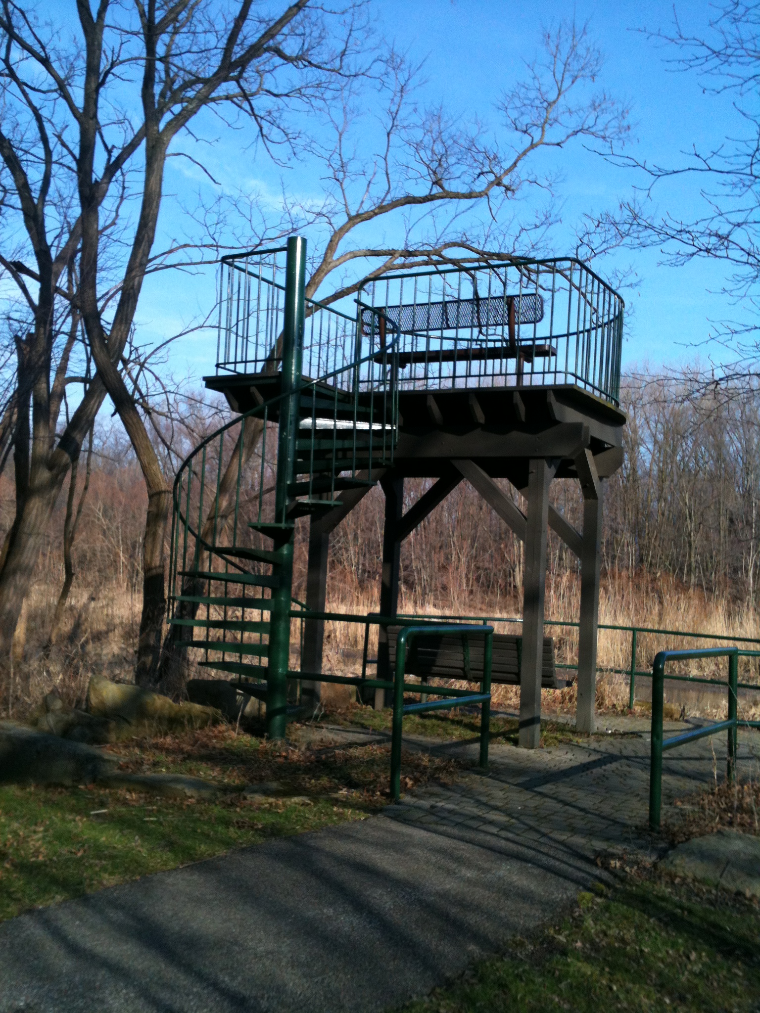At the end of a little offshoot from the main trail is this most magnificent little observation tower. It looks out over a lake and waves of cattails, and seems to be a great place for contemplating and brainstorming. Though the sounds of the rest of the world can still be heard– cars zooming down the parkway, people talking as they jog and walk by, the drone of airplanes coming and going from Cleveland Hopkins– it seems to sit outside of all that in some strange way, and that makes it a perfect little niche in the world for me to write.